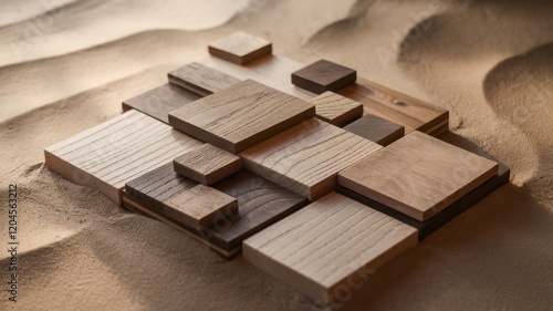 An artistic arrangement of various wooden panels on a sandy surface, highlighting textures and natural tones in warm, earthy colors.