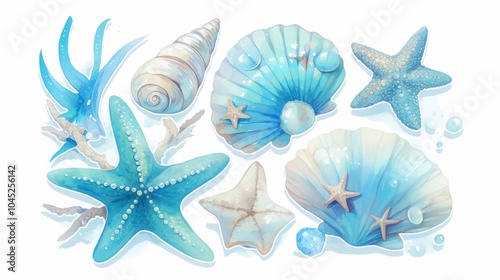 An artistic collection of blue seashells, starfish, and coral, evoking a serene underwater atmosphere.