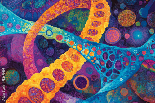 An artistic depiction of a cell with vibrant colors representing organelles,