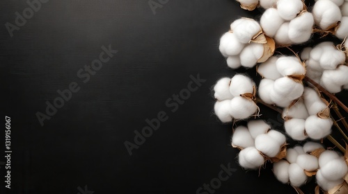 An artistic presentation of cotton bunches elegantly arranged on a dark surface, highlighting their texture and natural beauty in a sophisticated setting.