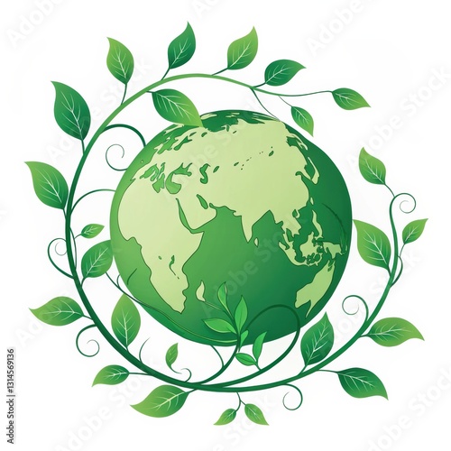 An artistic representation of a green Earth surrounded by vines and leaves promoting environmental awareness