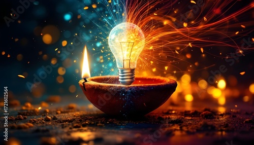 An artistic representation of a traditional clay diya transforming into a modern LED bulb, with abstract light patterns and vibrant colors, symbolizing the evolution from tradition to technology