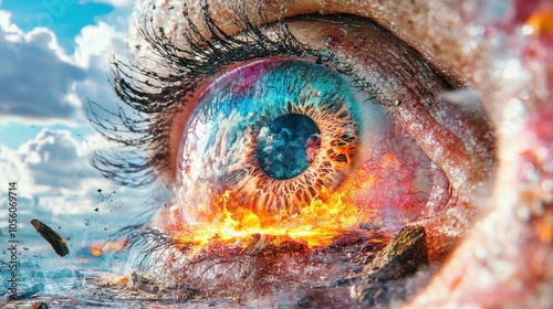 An artistic representation of an eye reflecting fire and water with a dramatic sky backdrop during daylight hours