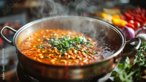An artistic shot of a pot of fragrant curry simmering on the stove, with colorful spices and herbs arranged around it, creating a rich culinary experience.
