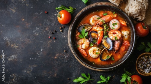 An artistic top view of bouillabaisse, showcasing a bowl filled with fresh seafood, tomatoes, and herbs, beautifully styled for a gourmet culinary presentation.