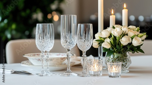 An artistic Valentines Day advertisement poster showcasing a charming dinner setting for two, complete with fine china, crystal glassware, and flickering candles. The deep depth of field highlights