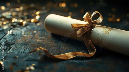 An artistic view of a diploma rolled up and tied with a ribbon, placed on a celebratory backdrop.