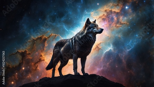 An artistic wolf silhouette in front of a cosmic scene, featuring a deep-space galaxy and scattered stardust, blending nature and