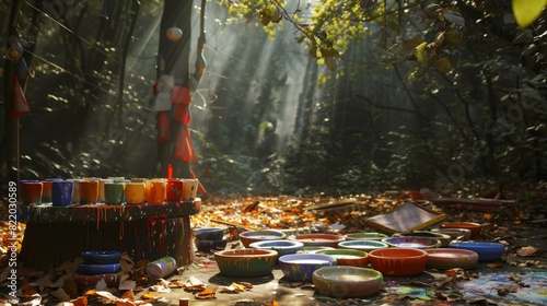 An artist's studio in an enchanted forest, with vibrant ceramics drying under filtered sunlight, inspiring creativity.