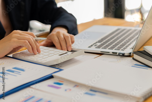An Asian accountant's hand is pressing a calculator and simultaneously analyzing financial graphs and a laptop next to it while still holding a pen in his finger.