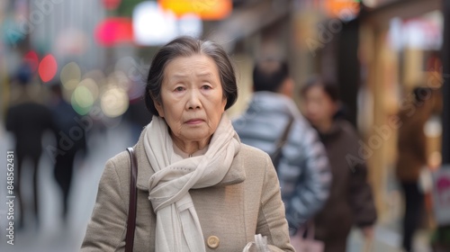 An Asian aunt, with black hair mixed with white hair, was walking.