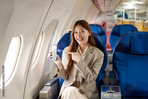 An Asian businesswoman travels abroad by plane, sitting near the window. She reads a book and uses her computer, utilizing her airline credit card to manage travel expenses efficiently.