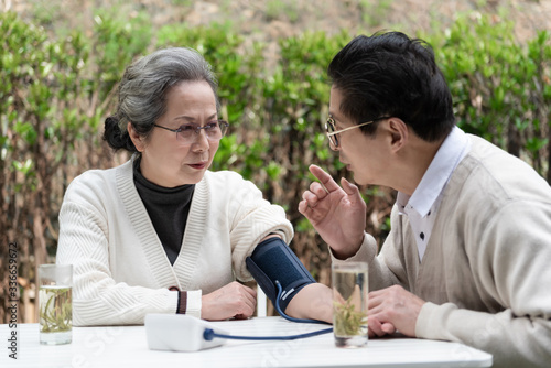 An Asian elderly couple is measuring blood pressure