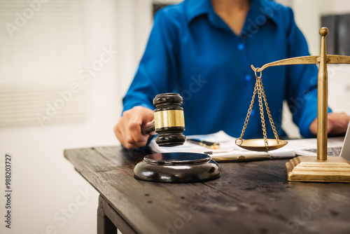 An Asian female lawyer sits at her desk in the office,working on legal documents with computer,providing online legal consulting,reviewing contracts,drafting wills,offering signature certification