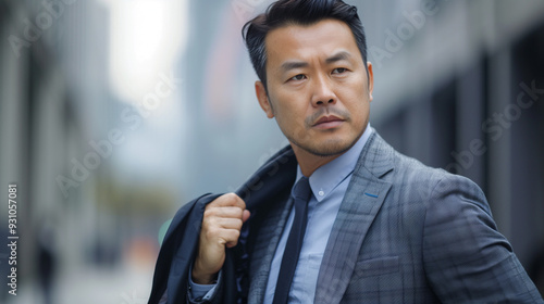 An Asian male businessman in a suit raising his arms in victory