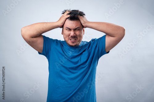 An Asian man in a blue t-shirt against a white background holds his head with both hands, screaming in frustration. His facial expression and pose convey stress, anger, or shock