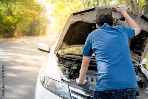 An Asian man opens the bonnet to check the engine compartment. Because his car is broken