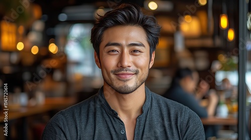 An Asian man smiles peacefully in a restaurant while relaxing on a weekend break, enjoying his casual dining experience in a cafe.