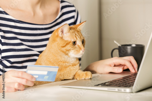 An Asian woman holds a credit card and is happily shopping online in her bed. And there is a cat beside. Concepts online shopping , life style, stay home, banks, financial transactions.