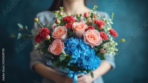 An Asian woman is holding a beautiful hand-bouquet flowers of blue Chrysanthemums, roses and red Hydrangea flowers, wrapped in two color silver and blue paper and ribbon