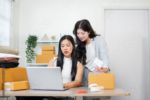 An Asian woman is showing e-commerce shipping orders on the website on a laptop to her colleague.