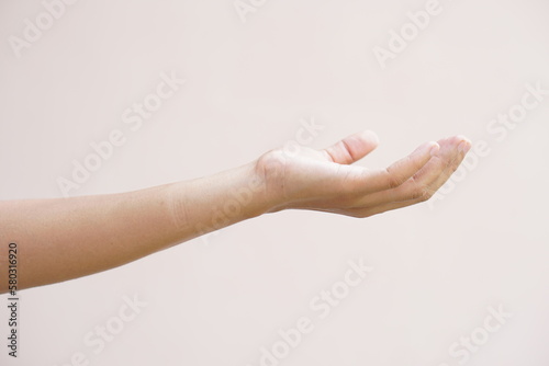 An Asian woman stretches her hand to the side like an empty object on her hand.