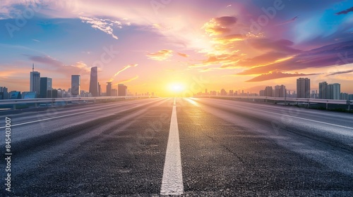 An asphalt highway leading towards a skyline with modern buildings, set against a sunset backdrop.