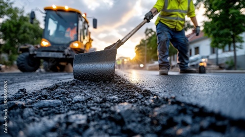 An asphalt paving worker is smoothing the newly laid asphalt on a road surface with a shovel, depicting the precision and effort involved in road construction.