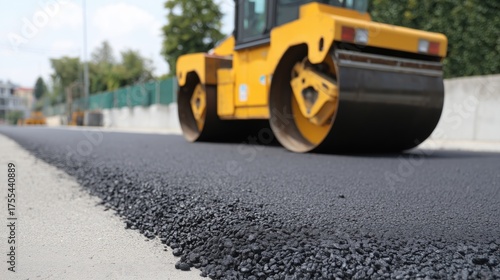An asphalt roller rolling the new road. Construction site. Yellow presser working at asphalt laying site