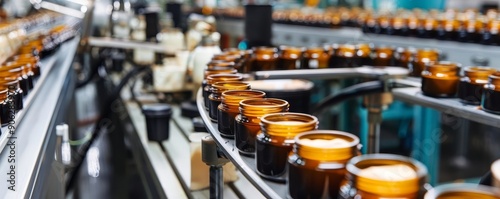An assembly line in a cosmetic factory, with rows of cream jars being sealed by automated equipment