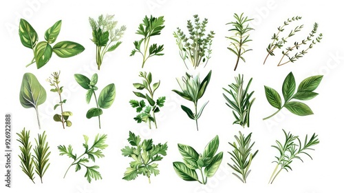 An assortment of 18 different fresh herbs, including rosemary, thyme, oregano, dill, basil, and parsley, isolated on a white background.