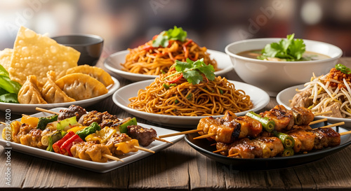 An assortment of Asian cuisine dishes including noodles, dumplings, skewers, soup, and fried wontons arranged on a wooden table.