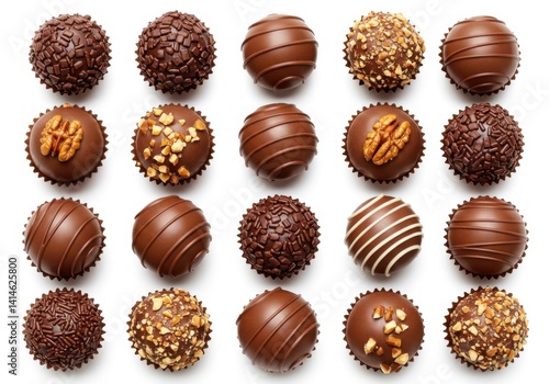 An assortment of chocolate truffles with various toppings arranged on a white background surface top view