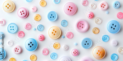 An assortment of colorful buttons scattered casually on a white background, featuring shades of blue, pink, yellow, and more with a soft, pastel aesthetic.