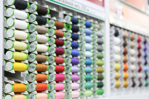 An assortment of different colors of thread lies on a shelf in a sewing shop. Copy space for text, selective focus. Needlework Material Theme.