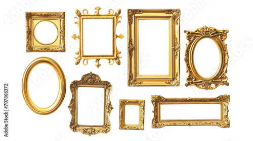 An assortment of eight golden picture frames of different sizes and patterns on a white background, showcasing intricate designs.