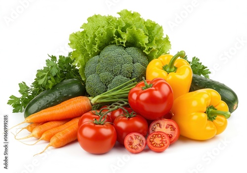 An assortment of fresh vegetables including tomatoes carrots and peppers on a white background surface