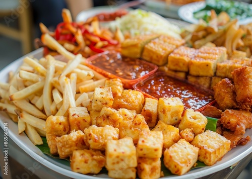 An assortment of fried snacks including French fries sambal sauce and tofu served on a plate