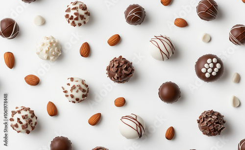 An assortment of gourmet chocolate truffles and almonds arranged on a white background, showcasing variety and indulgence.