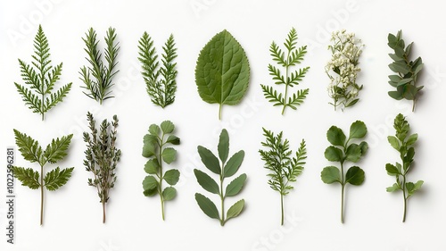 An assortment of herb and plant leaves isolated against a clean white background, showcasing the beauty of natural elements.