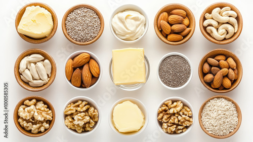 An assortment of nuts, seeds, and various types of butter and cream arranged neatly in bowls. A diverse and nutritious selection of foods.