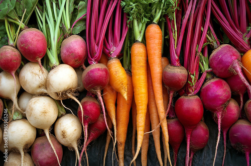 an assortment of root vegetables, such as carrots, beets, and radishes