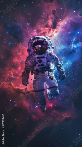 an astronaut floating in space, gazing at a distant, colorful galaxy with cosmic dust.