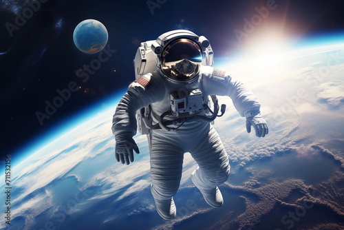An astronaut floating in space, with a view of Earth in the background. Astronaut in outer space over the planet Earth. Generated AI.