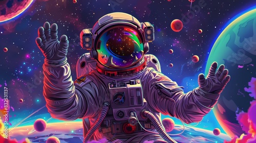 An astronaut floats in a vibrant, colorful galaxy, surrounded by stars and planets.