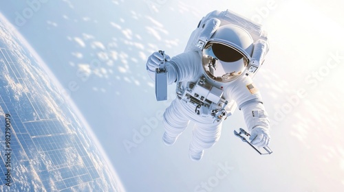 An astronaut floats in space, holding tools for a mission outside a spacecraft.