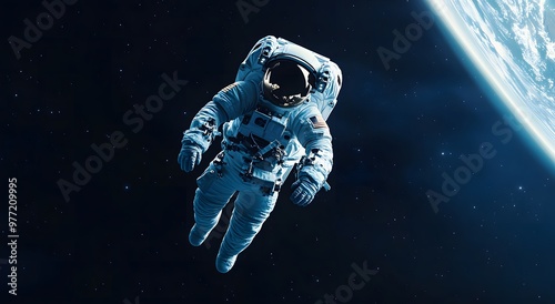 An astronaut floats in space, with Earth visible behind him. He is wearing a space suit. There are many stars around him, and 5K realistic science fiction, 3D sci-fi art