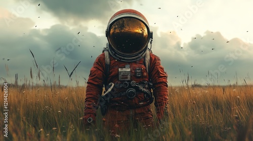 An astronaut in a grassy field under cloudy skies, symbolizing resilience and exploration. Perfect for sci-fi themes, inspirational visuals, and conceptual art.