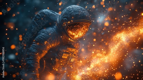 An astronaut surrounded by glowing particles, evoking a sense of exploration and wonder in space.