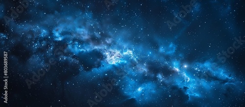 An astronomy-themed image featuring a stunning blue galaxy filled with glittering stars set against a dark black background